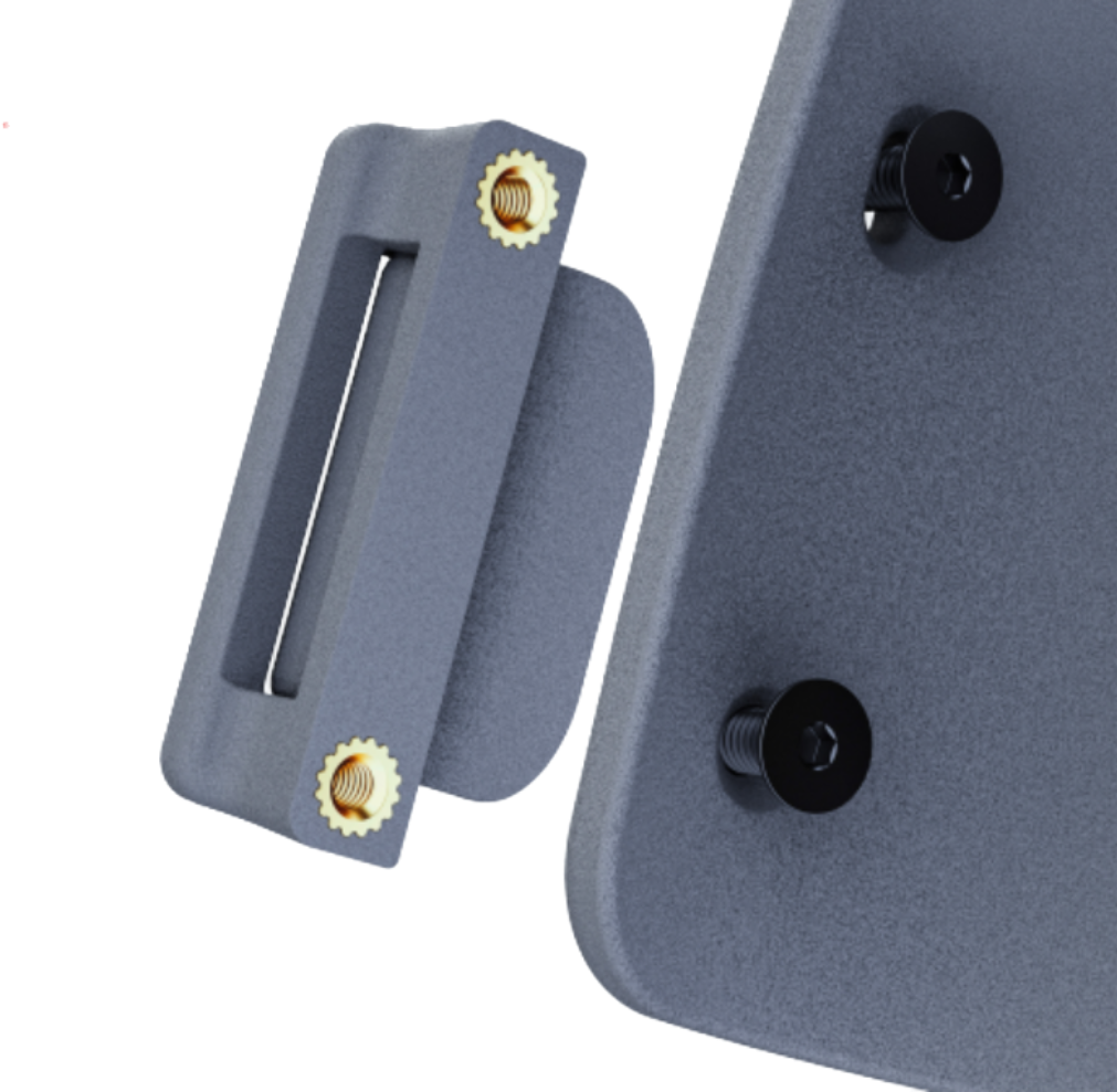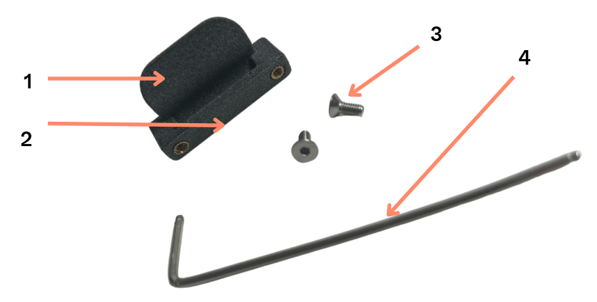 Each fastener consists of: (1) closing buckle and (2) fastener base, attached to the shell with two screws (3). Replacement screws and an Allen wrench (4) are included.