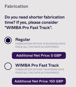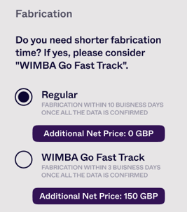 This page explains WIMBA Regular Track and Fast Track production options. You’ll find production times for Go, Pro, and Prosthesis Pro products, along with details on Fast Track availability, pricing, and requirements.